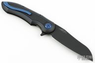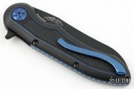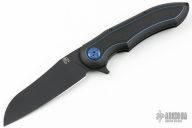 This Max Evo flipper by Millit Knives features a black blade with flipper and notched thumbrest. The handle has an anodized titanium frame with milled details, single titanium liner, anodized titanium backspacer, and a tip up titanium clip with hidden screws, has black and anodized hardware. Rides on bearings. Nice detent, lockup and blade seating. Comes with original box, papers, and zipper case. Has a couple light scuffs and scratches, excellent condition otherwise.