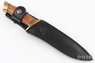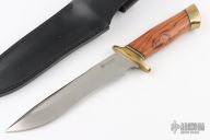 This Boker Magnum Knife features a satin finished recurve blade with swedge, .230" blade stock and 1.31" blade depth, hidden tang construction. The handle has a brass guard, black/brass spacers, wood grip, and brass butt. Comes with original leather sheath and box. Excellent condition.