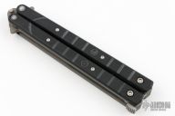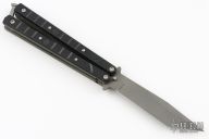 This Tanto Balisong Knife by Combative edge features a bead blast finished tanto blade with false top edge. The handle has black G-10 scales, blasted titanium liners and t-latch. Comes with original box and zippered case. Has a couple light scuffs and scratches, otherwise excellent condition.