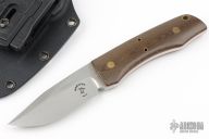 This Bulldog Fixed Blade by Charles Marlowe features a stonewash finished blade with a false top edge, .157" blade stock and 1.124" blade depth, full tang construction. The handle has green linen micarta scales with brass pins and red liners. Comes with a kydex sheath with TekLok. Has a few light scratches, otherwise excellent condition.