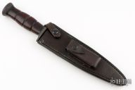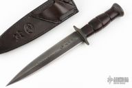 This Fairbairn Sykes Dagger by James Behring features a blued and hammer mark finished double edged blade, .228" blade stock and 1.271" blade depth, hidden tang construction. The handle has a blued steel guard and butt with a ribbed stacked horsehide grip. Comes with a black leather sheath. Excellent condition.