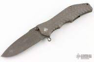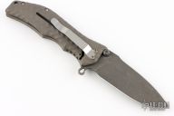 This Gunhammer from HTM Knives features a bead blast/acid wash finish drop point blade with notched thumbrest and flipper. Machined aluminum frame, tip down stainless steel clip. Notched thumbrest. Includes original box, papers, and zipper case. Has a few scuffs and scratches, great condition otherwise.