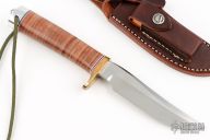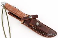 This Model 3-5 by Randall Made Knives features a satin finished blade with false top edge, .191" blade stock and 1.124" blade depth, hidden tang construction. The handle has a brass guard, stacked leather grip with red/white/blue spacers, duralumin butt. Comes with a brown leather sheath with sharpening stone and original paper wrapping. Excellent condition.