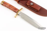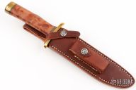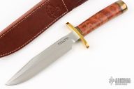 The Model 1 was made famous by Allied combat troops in World War II and has since been widely used in all theaters of war. It has a satin finished blade with sharpened top edge, .210" blade stock and 1.308" blade depth, hidden tang construction. The handle has a forward curved brass guard and butt, thuya burl grip with black/brass spacers. Includes brown leather sheath and original paper wrapping. Excellent condition.