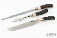 "Designed to meet every requirement as the ideal table knife, it is rustproof and will resist staining as ordinary blades do when used in carving meat. Complete with high-quality stag handled Sharpening Steel and Fork. A three-compartment felt case is included. " Satin finished blade with .167" blade stock and 1.171" blade depth, hidden tang construction. Nickel silver guards with stag grips and red/white/blue spacers. Comes with cloth rollup, and original papers. Excellent condition.