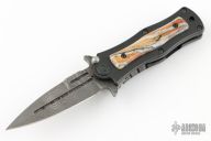 This Madd Maxx 3" Assisted Flipper is a Darrel Ralph Design executed by HTM Knives. It features a Damascus bayonet ground blade with false top edge, fullers, flipper and dual thumb studs. The handle is comprised of a darkened and stonewash titanium frame with Mammoth Ivory overlays over barrel spacers. Stainless steel pocket clip is positioned for tip down carry. Lanyard hole in pommel. Comes with original box, papers, and zipper case. Has a couple light scuffs on the frame, otherwise Excellent condition.