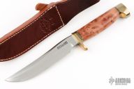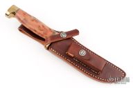 This model 3-6 from Randall Made Knives has an upswept satin finished blade with false top edge, .206" blade stock and 1.162" blade depth, hidden tang construction. The handle has a brass guard and butt, thuya burl wood grip, black/brass spacers. Includes brown leather sheath and original paper wrapping. Excellent condition.