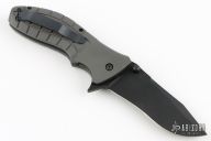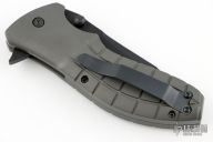 This Kirby Lambert model SNAP flipper features a black recurve blade with dual thumbstuds and a flipper. The handle has a gray aluminum frame. Black stainless steel tip up clip. Comes with nylon zippered case and original box and papers. Has a couple light scuffs, excellent condition otherwise.