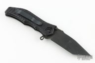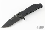 This Gunhammer from HTM Knives features a black tanto blade with notched thumbrest and flipper. Machined aluminum frame, tip up or down reversible black stainless steel clip. Notched thumbrest. Strong and fast assisted opening. Comes with original box, papers, and zipper case. Has some light scuffs and scratches, appears resharpened, great condition otherwise.
