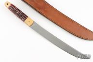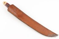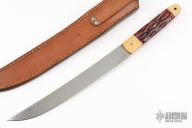 This Large Tanto by Newt Livesay features a hand rub satin finished blade with visible temper line, .200" blade stock and 1.105" blade depth, full tang construction. The handle has ivory linen micarta bolsters, jigged bone scales, lanyard hole at the butt. Comes with a brown leather sheath. Has a couple light scratches, otherwise excellent condition.