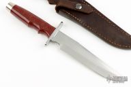 This Fighter by Jim Ort features a satin finished blade with a false top edge, .185" blade stock and 1.475" blade depth, hidden tang construction. The handle has a stainless steel guard, nickel silver butt, red linen micarta grip. Comes with a brown leather sheath. Has some light scratches, otherwise excellent condition.