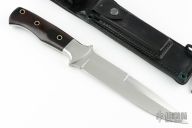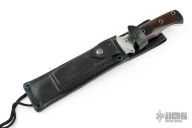 This SERE 6 from Al Mar Knives features a spear point blade with false top edge, .194" stock and 1.364" depth, full tang construction. The handle has black/brown paper micarta scales, brass tube pins over red liners, stainless steel bolsters.  Comes with original black leather sheath. Has a couple light scratches, otherwise excellent condition.