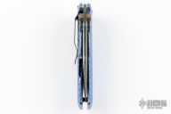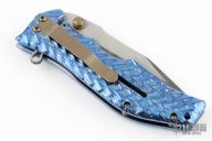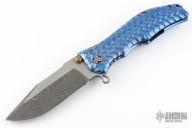 This Gunhammer flipper from HTM Knives features a two-tone Damascus clip point blade with notched thumbrest and flipper. Machined titanium polished frame, tip down black stainless steel clip. Notched thumbrest. Comes with original box, papers, and zipper case. Has a couple light scuffs and scratches, excellent condition otherwise.