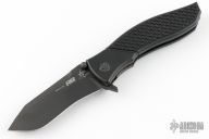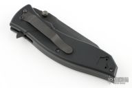This Greg Lightfoot model Bullwhip flipper features a black recurve blade with dual thumbstuds and a flipper. The handle has a black milled aluminum frame. Black stainless steel tip down reversible clip. Comes with nylon zippered case and original box and papers. Has a couple light scuffs, excellent condition otherwise.