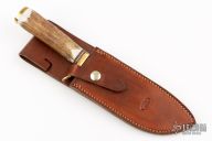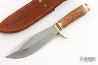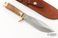 This knife by Jim Jennings features a hand rub satin finished blade with notched thumbrest, .250" blade stock and 1.832" blade depth, hidden tang construction. The handle has a brass guard and butt with a stag grip and leather/brass spacers. Comes with a brown leather sheath. Has some light scratches, otherwise excellent condition.