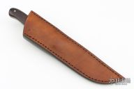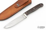 This knife by Dave Armour features a hand rub satin finished blade with visible temper line, .163" blade stock and 1.039" blade depth, full tang construction. The handle has a nickel silver guard with wenge wood scales. Comes with a brown leather sheath. Has a couple light scratches, otherwise excellent condition.