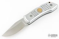 This auto by MCM Maniago Italy features a satin finished blade. The handle has aluminum scales, brass button, stainless steel liners and rocker bar, brass backspacer at the butt. Has light scuffs and scratches, great condition otherwise.