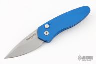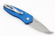 This Sprint by Pro-Tech has a stonewashed blade and a blue aluminum handle. Stainless steel clip. Comes with original box and papers. Excellent condition.