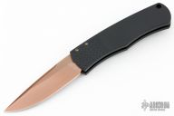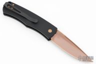 This Magic BR-1 Bolster Release Automatic from Pro-Tech Knives features a Rose Gold finished stonewashed 154-CM blade with swedge. The handle has a black aluminum frame with checkered bolster. Black coated stainless steel clip is positioned for tip up carry. Lanyard hole in the pommel. Comes with original box and papers. Excellent condition.