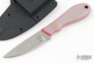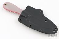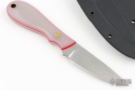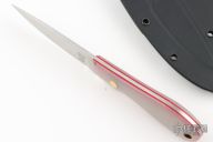 This K-47 Black Widow Caper by Dozier Knives features a satin finished blade with .099" blade stock and .822" blade depth, full tang construction. The handle has natural G-10 scales with red liners, brass pin and lanyard hole. Comes with a kydex sheath. Excellent condition.