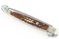 This Sicilian Ring Pull Stiletto from AGA Campolin features a tumbled bayonet ground blade. The handle has a nickel silver bolsters and ring-pull with stag scales over brass liners and stainless steel backspacer.  Includes a leather slip sheath. Has some light scuffs and patina. Excellent condition otherwise.