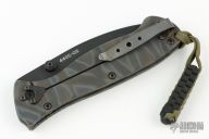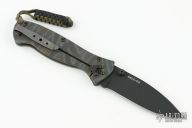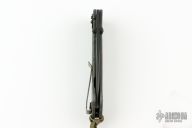 This Combat Elite Level 1 features a black drop point blade with dual thumbstuds. The handle has a bead blasted and flame anodized titanium frame with black hardware and black stainless steel tip up or down reversible clip, lanyard hole at the butt. Comes with zipper case and extra clip. Has some scuffs/scratches on the frame/clip. Good condition otherwise.