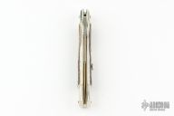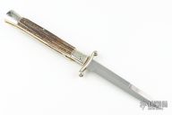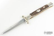 This 13" Heavy Frame Swinguard Auto from A.G.A. Campolin has a mirror polished stainless steel spear point blade with false top edge. Handle has stag scales with mirror polished nickel silver bolsters and pommel, brass liners, brass pins, stainless steel backspacer. Has oval button and safety. Comes with zipper case. Has some light scuffs and scratches, excellent condition otherwise.