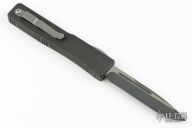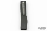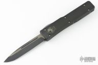 This Ultratech OTF automatic from Microtech features a black blade with swedge and fullers. The handle has a black anodized aluminum handle with stainless steel thumb slide and tip down clip. Dated 01/2003 with a serial number of 2735. Has some light scuffs on the frame, otherwise excellent condition.