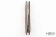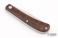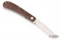 This Trapper by Bret Dowell features a satin finished clip point blade with nail nick. The handle has rag micarta covers with stainless steel escutcheon, stainless steel liners and spring. Has half-stop, flush in all positions.  White liners. Comes with a padded case.  Excellent Condition.