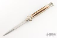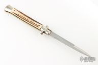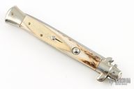 This Picklock Auto from Stiletto Italy features a mirror finished bayonet ground blade with false top edge. The handle has nickel silver bolsters and pommel with stag scales over brass liners and stainless steel backspacer. Has a few scratches, otherwise excellent condition.