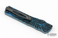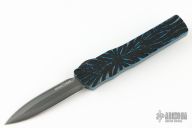 This Small Twist Tighe by Brian Tighe and Friends features a black dagger blade with swedge. The handle is blue/black DLC distressed aluminum with a tip down milled titanium clip with a ceramic ball. Comes with original box, #0193. Excellent condition.