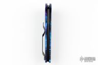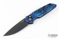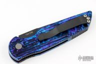 This TR-3 Side Opening Auto has a black coated spear point blade with swedge. Handle is jazz anodized aluminum with stainless steel tip up clip. Lanyard hole at butt. Comes with original box and papers. Excellent condition.