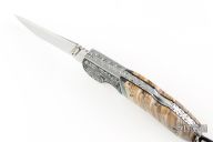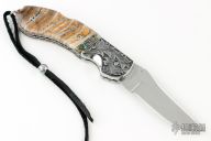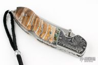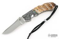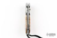 This Assisted Open lockback by Mike Whiskers Allen features a mirror polish blade with fileworked spine. The handle has engraved dovetailed stainless steel bolsters, abalone insert, with black G-10 backing, mammoth scales, fileworked stainless steel liners and a fileworked stainless steel backspacer. "AIDA Whiskers 12*10" inside backspacer. Nice action, lockup and blade seating. Comes with zippered case. Excellent condition.
