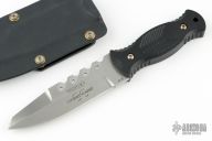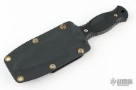 This fixed blade designed by Fairall features a satin finish blade with clip point, .15" stock, and 1.229" blade depth. Full tang construction with milled black handles. Marked "Proto #3" on blade. Includes a black kydex sheath. Has a couple light scuffs, excellent condition.
