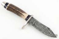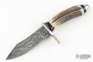 This knife by Red Troll Forge features a Damascus (1095 and 15N20) blade with .176" blade stock and 1.169" blade depth, hidden tang construction. The handle has a nickel silver guard and butt, sambar stag grip with kirinite spacers. New from maker.