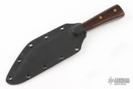 This knife by Red Troll Forge features a Damascus (1095 and 15N20) blade with .156" blade stock and 1.474" blade depth, full tang construction. The handle has rosewood scales with mosaic pins. Comes with a kydex sheath. New from maker.