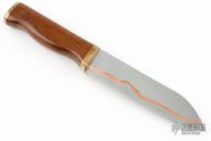 This knife by Red Troll Forge features a hand rub satin finished copper San Mai blade with .160" blade stock and 1.455" blade depth, hidden tang construction. The handle has a brass guard and butt with a wood grip. New from maker.