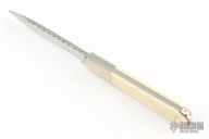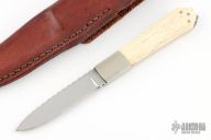 This knife by Bob White features a mirror polished blade with fileworked spine and full tang construction, .120" blade stock and .558" blade depth. The handle has dovetailed nickel silver bolsters, interior walrus ivory scales, fileworked butt.  Includes a brown leather sheath. Comes with a brown leather sheath. Excellent condition.