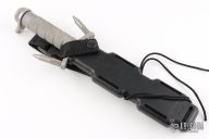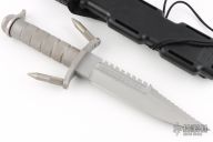 This Buckmaster 184 from Buck Knives has a bead blast blade with a sharpened and serrated top edge, has sawteeth on spine, .289" blade stock and 1.435" blade depth, hidden tang construction and a hollow knurled handle. Includes original sheath and removable grappling hooks. Has some light scuffs, otherwise excellent condition.