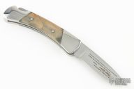 This Model 500 Duke by Buck Knives has a mirror polished blade with nail nick. The handle has a polished stainless steel frame, wood scales and stainless steel backspacer. Comes with original box, papers and wooden display stand. Excellent condition. The wood on this knife is from a beam removed from the Old North Church of Paul Revere fame.