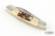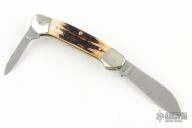 This slipjoint by Remmington has two blades with nail nicks. The handle has nickel silver bolsters, stag covers, brass liners and steel springs. Has a nickel silver escutcheon. Comes with original box and papers. Excellent condition. #357