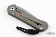This Small Inkosi by Chris Reeve Knives features a tumble finished blade with dual thumb studs and notched thumbrest. The handle has a bead blasted titanium frame with natural canvas micarta inlays over a single barrel spacer. The bead blasted titanium clip. Lanyard on pommel. Comes with original box and COA dated November 11, 2021. Excellent Condition.