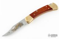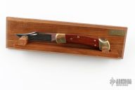 This Model 110 by Buck features a laser engraved blade with nail nick. The handle has a brass frame with wood scales. Comes with original box, papers and wooden display stand. #853 of 1000 on blade. Excellent condition.