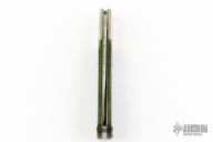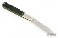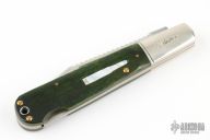 This lockback by Remmington has a satin finished blade with nail nick. The handle has nickel silver bolsters, green bone covers with a mother of pearl bullet escutcheon, brass liners and steel springs. Has a few light scratches, otherwise excellent condition. Dated 2000. Comes with original box and papers.