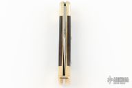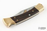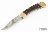 This Model 110 by Buck features a laser engraved blade with nail nick. The handle has a brass frame with wood scales. Comes with original box, papers, wooden display case with ornamental lid. #323 of 1000 on blade. Has a little patina, otherwise excellent condition.