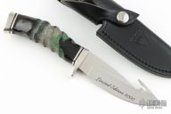 This Zipper by Buck features a satin finished blade with guthook, .140" blade stock and 1.125" blade depth, hidden tang construction. The handle has a nickel silver guard and butt with an impala horn grip, black and nickel silver spacers. Comes with originla box, sheath and papters. #495/2000. Excellent condition.