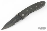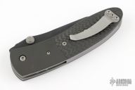 This Lightfoot LCC D/A side opener by Microtech has a black partially serrated blade, black titanium bolsters, and carbon fiber scales. Stainless steel clip and liners. Dated 07/2001 and #6035. Comes with original box, papers, and nylon sheath. Excellent condition.