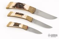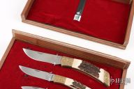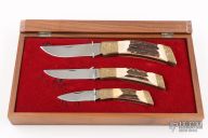 This matched set of Gerber Folding Sportsman I, II and III is very spcial. They are made by our most experienced craftsman using the finest materials available. We are proud of them and hope you are too. The steel is 440C stainless, the very best! It is hardened to 57-59C on the Rockwell scale. The handles are select sambhar stag from India. The brass sides are presicion die castings. Each knife is hand engraved by a master engraver. Comes with a wooden presentation box and COA #150/1000. Has some patina from being in the case, otherwise excellent condition. The lid of the box is broken.