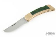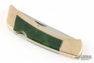 This Folding Sportsman by Gerber features an upswept blade with nail nick. The handle has a brass frame with jade inlays. Excellent condition. Comes with original wooden display case.
