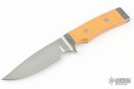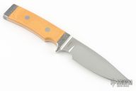 This Integral Hunter by Gerry Jean features a hand rub satin finished blade with .190" blade stock and 1.252" blade depth, full integral tang construction. The handle has an engraved stainless steel guard and butt with ivory paper micarta inlays. Excellent condition. Stamped "GJ 74" on the ricasso. Excellent condition.